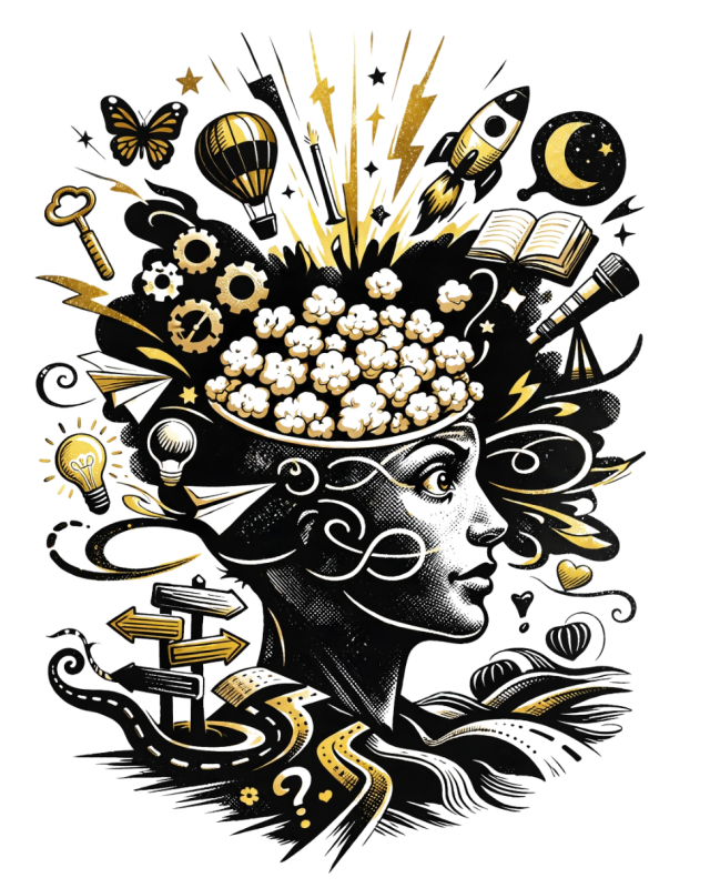 Je hoofd vuurt ideeën af als popcorn, maar dat betekent niet dat jij al die wegschietende korrels moet vangen. Inspiratie is soms gewoon een lekker feestje in je hoofd.