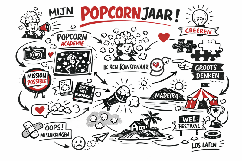 Dat was het begin van een grote verschuiving. Ik herstructureerde in het voorjaar mijn aanbod en omarmde helemaal het beeld van mensen met een popcornhoofd. Niet langer als metafoor, maar als mijn speelveld: voluit. Daaruit ontstond de Popcornacademie, een plek waar creatieve brein niet worden afgeremd, maar juist worden gevierd in alle veelzijdigheid.